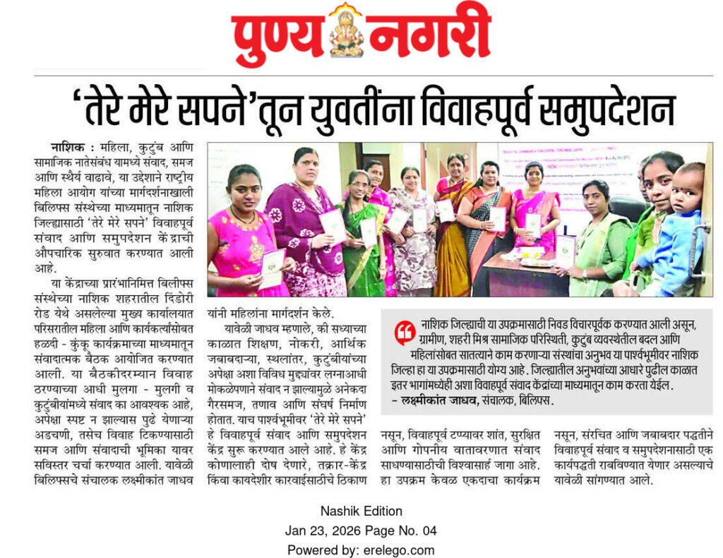 राष्ट्रीय महिला आयोग (NCW) यांच्या मार्गदर्शनाखाली बिलीफ्स संस्था (BELIEFS) यांच्या माध्यमातून नाशिक येथे ‘तेरे मेरे सपने’ विवाहपूर्व संवाद आणि समुपदेशन केंद्र (PMCC) सुरू करण्यात आले.